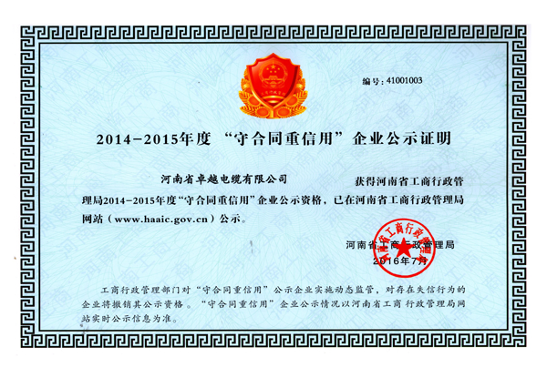 祝賀河南省卓越電纜有限公司成為**“守合同 重信用企業(yè)”