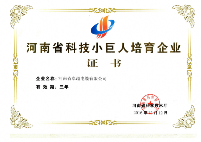 祝賀河南省卓越電纜有限公司成為“河南省科技小巨人培育企業(yè)”